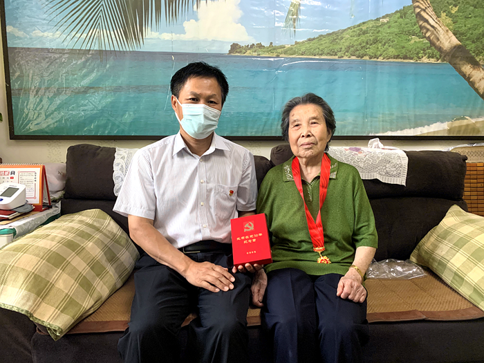 7月1日下午,在中国共产党成立101周年之际,受永利集团304登录党委委托,党委副书记吴瑞峰带队来到离休干部孙华云家中,向她颁发“光荣在党50年”纪念章。孙华云同志今年已91岁高龄,1946年9月1日参加工作,1972年7月1日入党,是集团原合纤厂工会干部。