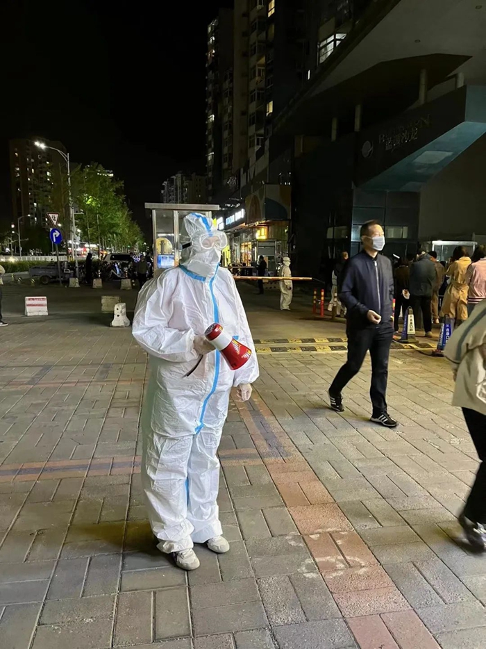 华腾丹陛华业务骨干刘纯在潘家园街道潘家园东里社区参加核酸检测现场秩序维护或信息录入工作。