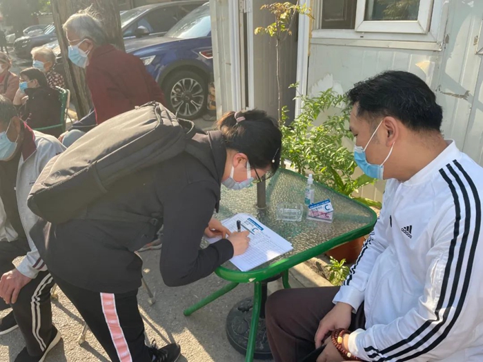 共产党员杨帆在潘家园街道潘家园东里社区参加核酸检测现场秩序维护或信息录入工作。