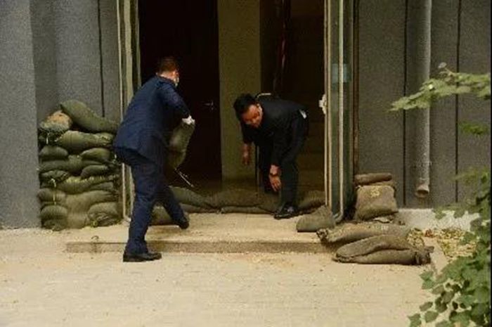 此次防汛应急演练内容是假设雨季汛期来临时连降暴雨,雨水倒灌进嘉宾楼北侧安全出口,发生了险情的应急处置。演练中,巡查人员发现险情后,迅速报告防汛指挥办公室,防汛组长下令立即启动防汛应急预案并赶往现场进行指挥,各部门防汛队员接到指令后迅速赶到现场,防汛队员使用防汛沙袋堆积在发生倒灌的安全出口处,防止水流继续涌入,并使用扫帚、铁锹等防汛工具将场内积水清理进排污井内,工程部开启相关抽水泵清除场内积水。整个演练过程用时20分钟,参演人数10余人,物资准备充分,人员配合默契,工作有条不紊,应急处置得当。